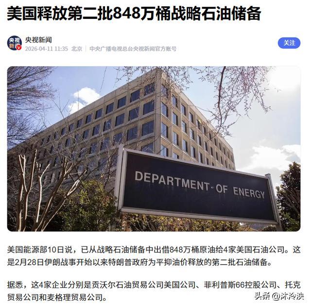 4月10日当天,美国能源部宣布,再向4家石油公司“出借”848万桶战略石油储备,这已经是2月底冲突以来的第二批释储,第一批4520万桶早就放出去了,按计划美国要总共释放1.72亿桶,一直放到2027年!