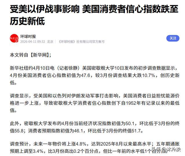 就在哈里斯表态的同一天,密歇根大学的经济数据把美国的遮羞布撕得干干净净,4月消费者信心指数暴跌到47.6,比3月狂跌10.7%,创下1952年有记录以来的最低值。